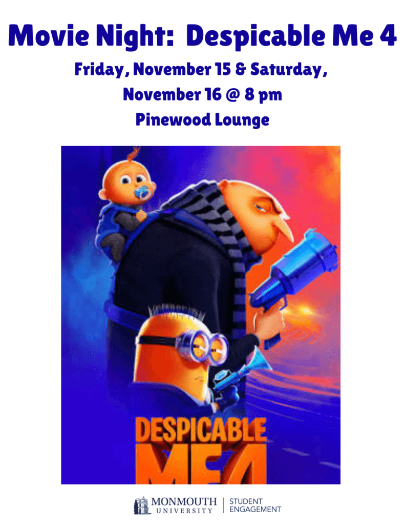Gru welcomes a new member to the family, Gru Jr., who’s intent on tormenting his dad. However, their peaceful existence soon comes crashing down when criminal mastermind Maxime Le Mal escapes from prison and vows revenge against Gru. Saturday, November 16 at 8 pm in Pinewood Hall Lounge.