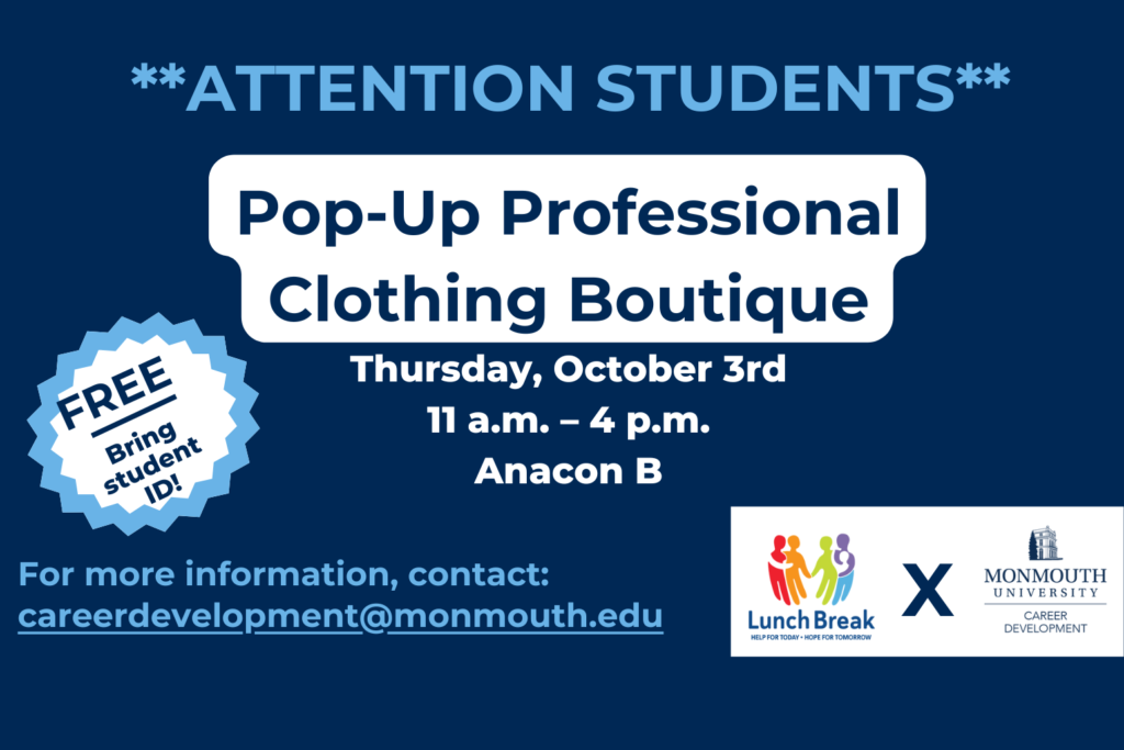Stop by Anacon B on Thursday, Oct. 3rd from 11am-4pm to suit-up for success! Come browse through a collection of professional clothing attire donated by the Monmouth campus community in partnership with Lunch Break and Clara’s Closet.