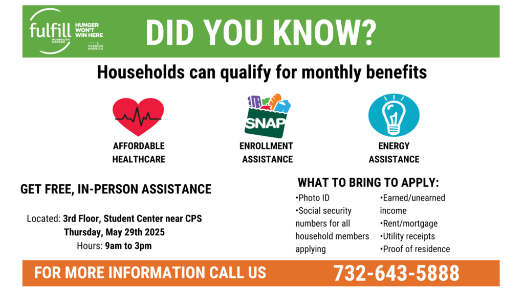 Not sure if you qualify for SNAP and Health Insurance? Fulfill NJ will be on campus this Thursday, May 29th from 9am-3pm on the 3rd Floor of the Student Center, near the Counseling and Prevention Services office.