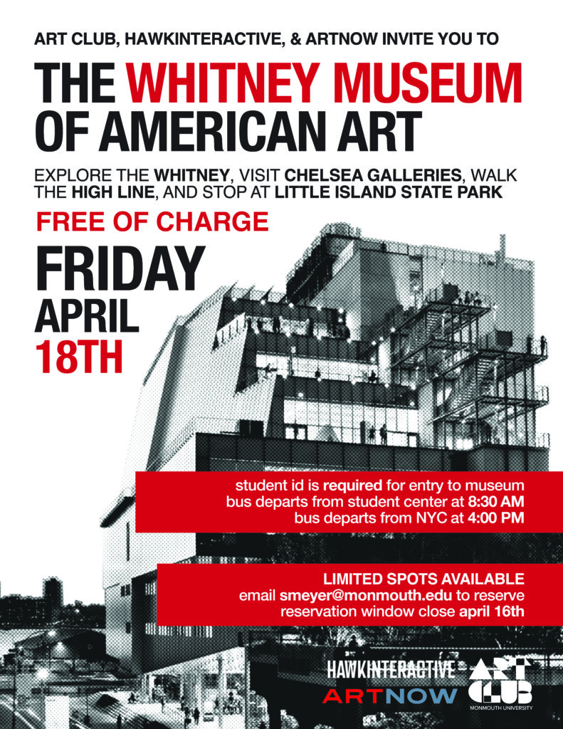 Art Club, HawkInteractive, and ArtNow invite all students to a trip to the Whitney Museum of Art on April 18. Explore the Whitney, visit the nearby Chelsea galleries, walk the High Line, and stop at Little Island State Park.