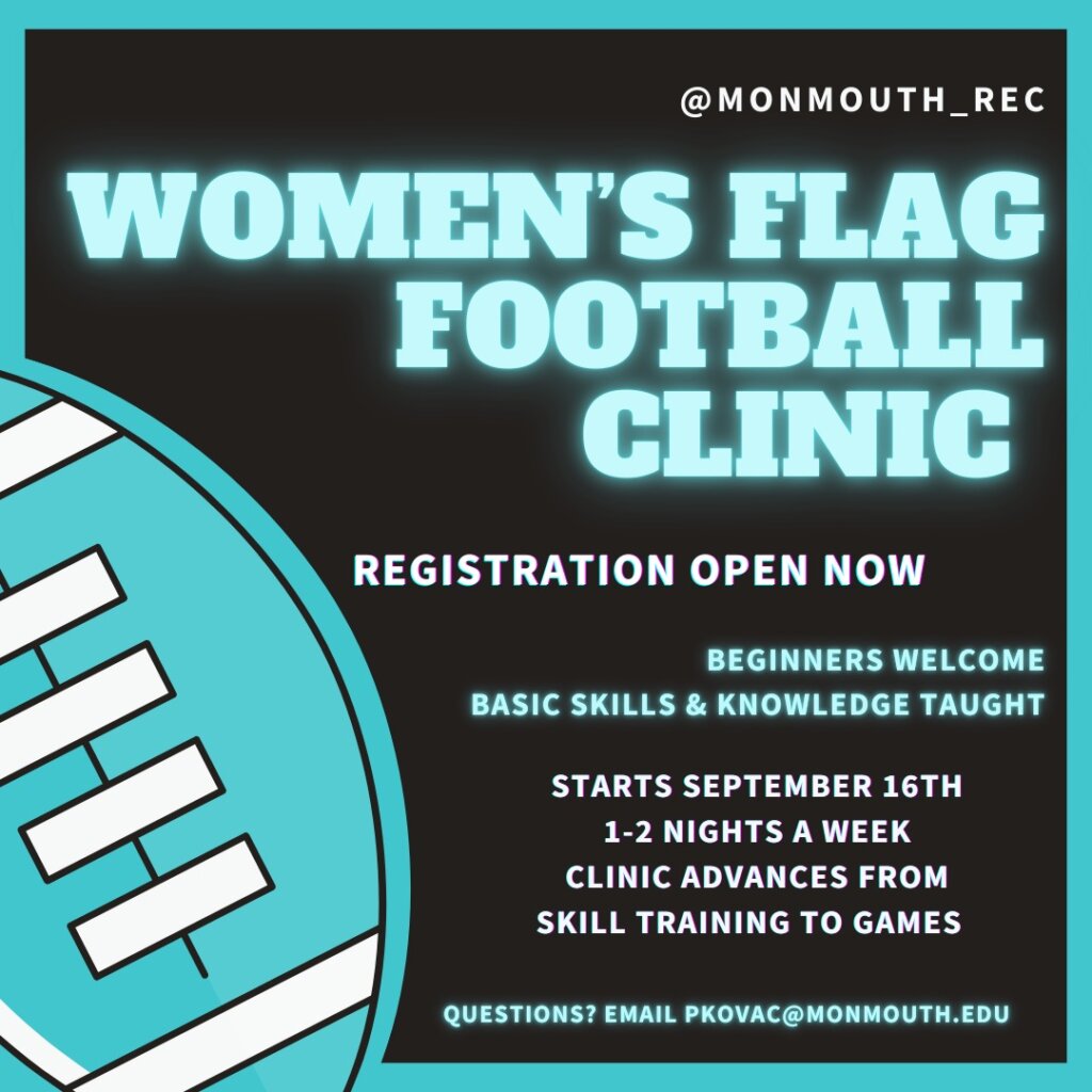 Monmouth Recreation will be offering a Women’s Flag Football Clinic. Clinics open to all girls of any skill level! We will teach you flag football skills, knowledge and strategy, and students will have the opportunity to play actual games. Our clinics are an awesome way to meet people and make new friends on campus! Additionally, students will have a chance to make the flag football team that will play in the NIRSA Regional Championships down at the University of Maryland. The clinic will begin the week of September 16th!