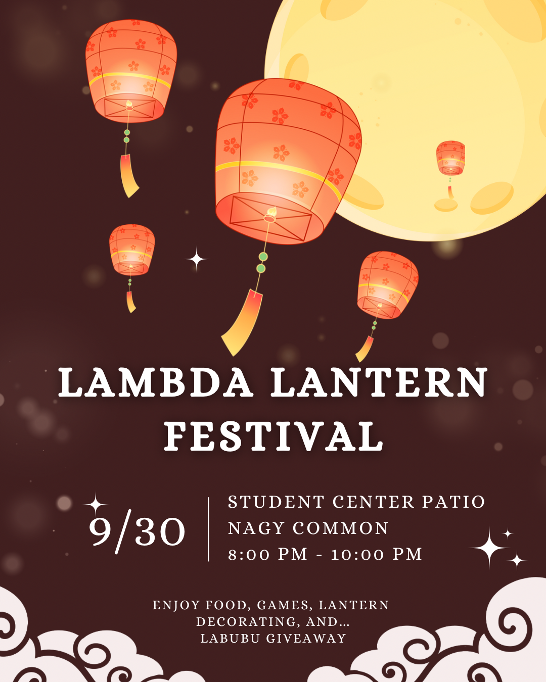 Student Center PatioCelebrate culture, community, and creativity with Lambda Theta Phi! Enjoy an evening filled with delicious food, fun games, and lantern decorating. Don't miss your chance to enter our special Labubu give-a-way and light up the night with us!