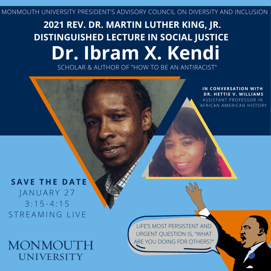 - Wednesday, January 27 from 3:15 to 4:15 p.m: This event will be held virtually. We are very fortunate to host one of the leading antiracist scholars in the country on our campus, Dr. Ibram X. Kendi, author of the New York Times bestselling How to be an Antiracist. Dr. Hettie V. Williams, Assistant Professor of African American History, will be joining Dr. Kendi in dialogue.
