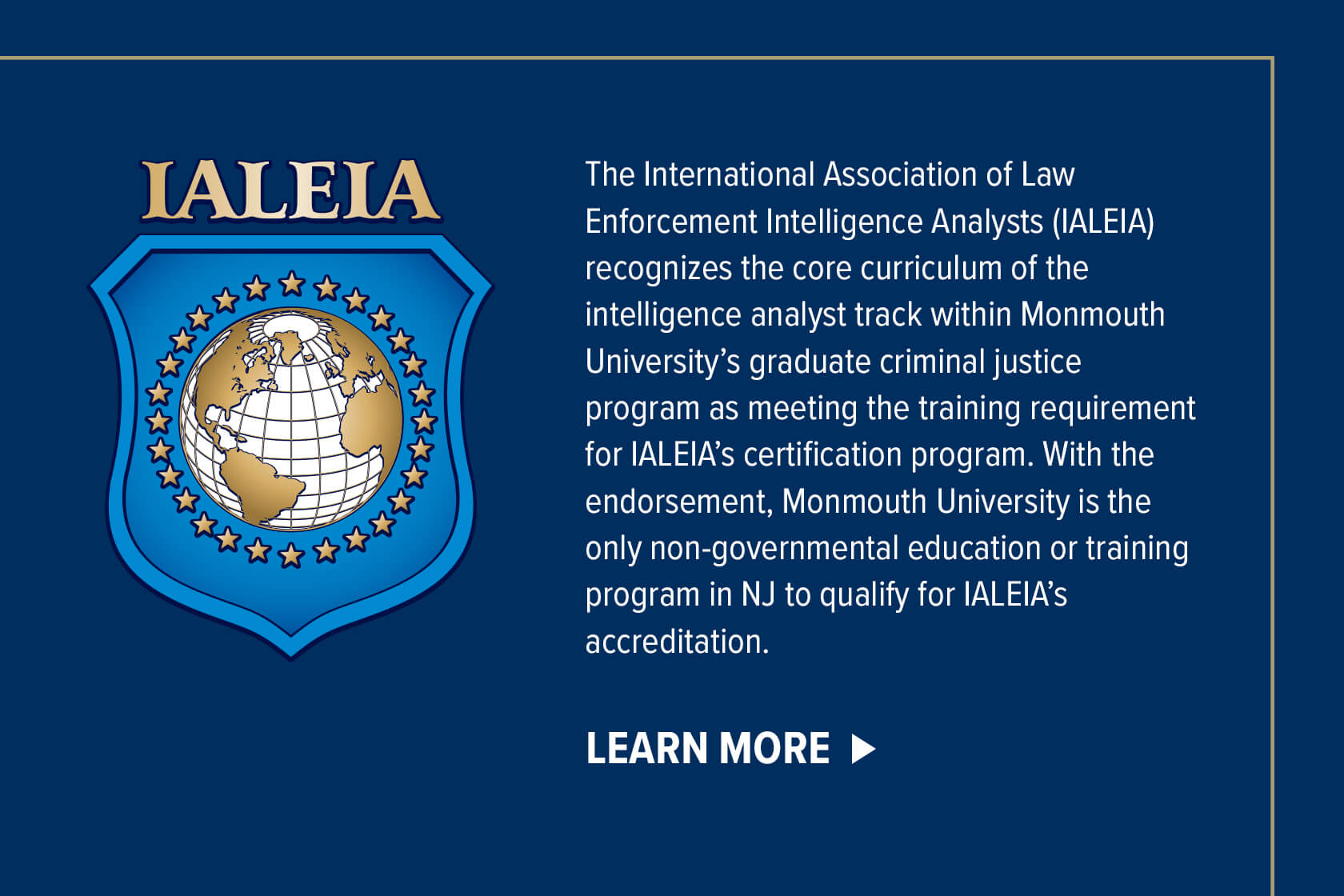 Monmouth University’s Master of Arts in Criminal Justice – Intelligence Analyst Track (CJ 621 Fundamentals of Intelligence Analysis; CJ 622 Advanced Issues in Intelligence and CJ 636 Structured Analytic Techniques) meets IALEIA’s criteria for a basic intelligence course. These criteria are based on guidelines provided in the Law Enforcement Analytic Standards (2012) and the Minimum Criminal Intelligence Training Standards (2007) published by the US Department of Justice Global Justice Information Sharing Initiative. Individuals who complete this Program meet the training requirement for IALEIA’s Professional Certification Program. Together, these courses have been added as an accepted program. Additional information about the certification program can be found on IALEIA’s website.