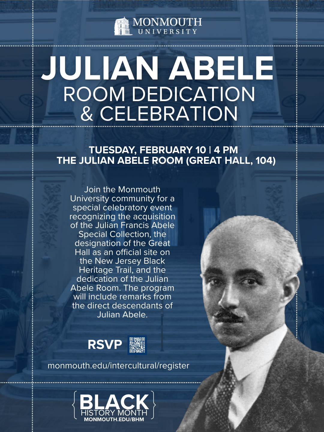 | 2/10 | Julian Francis Abele Room Dedication and Celebration (Flyer) * | 4-6 PM | Great Hall | Julian Abele Room (104) (Register) |