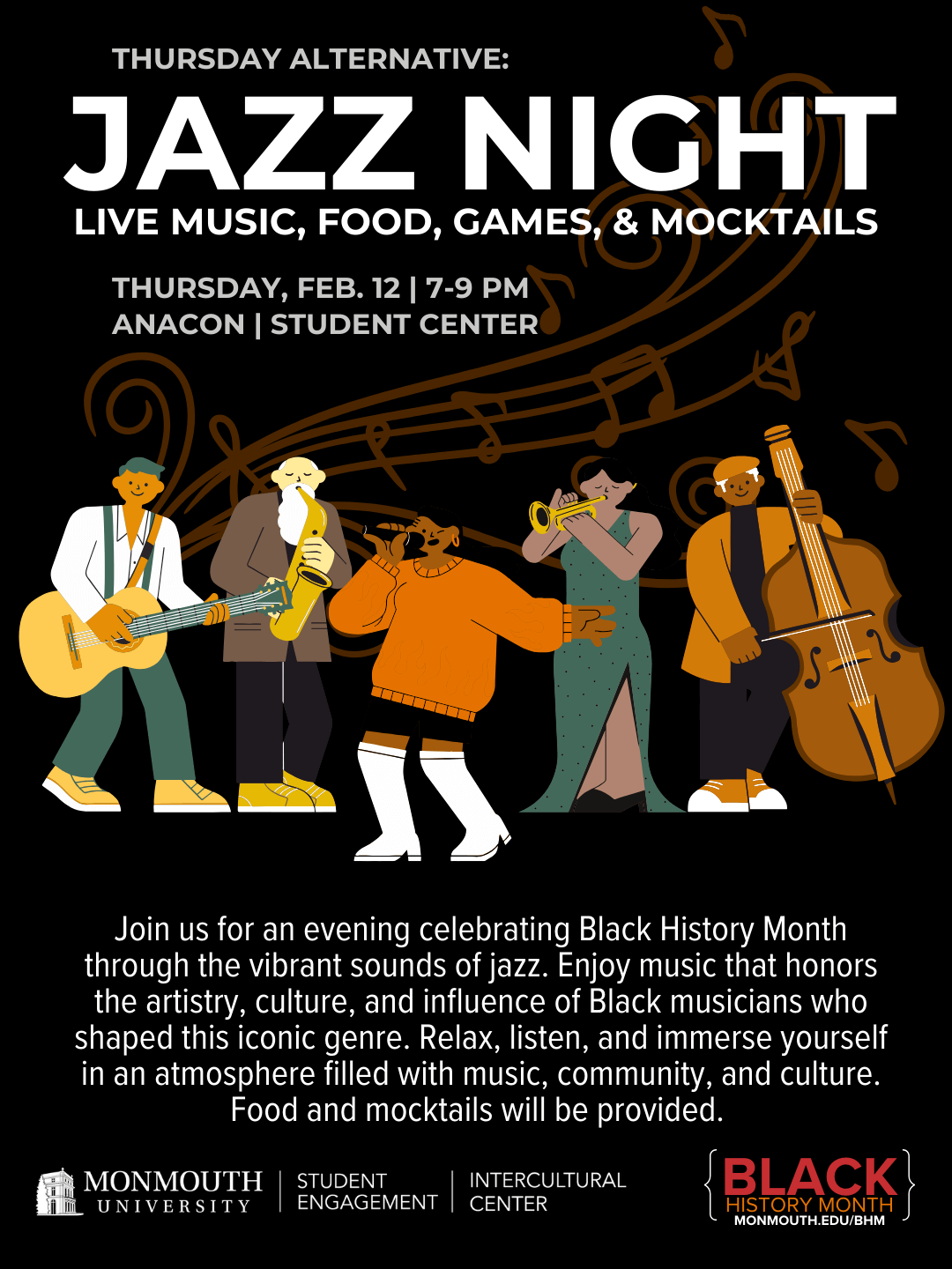 | 2/12 | Thursday Alternative: Black History Month Jazz Night (Office of Student Engagement & the Intercultural Center) (Flyer) | 7 PM | Anacon (Register) |