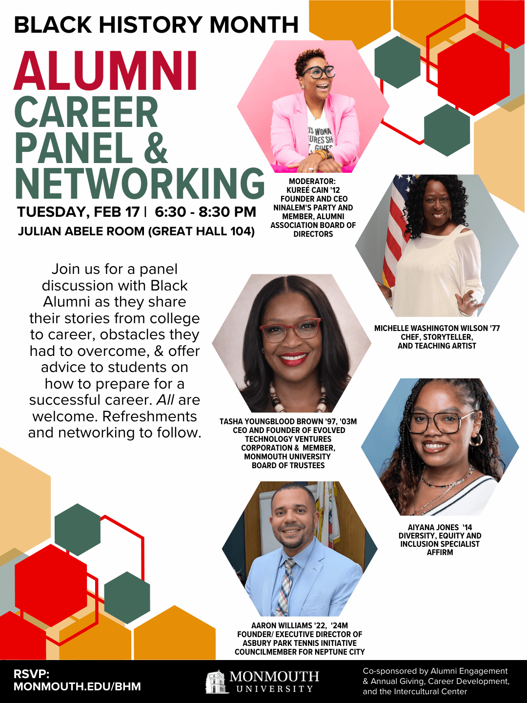 | 2/17 | Black History Month Alumni Career Panel & Networking (Presented by the Intercultural Center, Career Development, and Alumni Engagement & Annual Giving) (Flyer)* | 6 PM | Great Hall | Julian Abele Room (104) | RSVP |