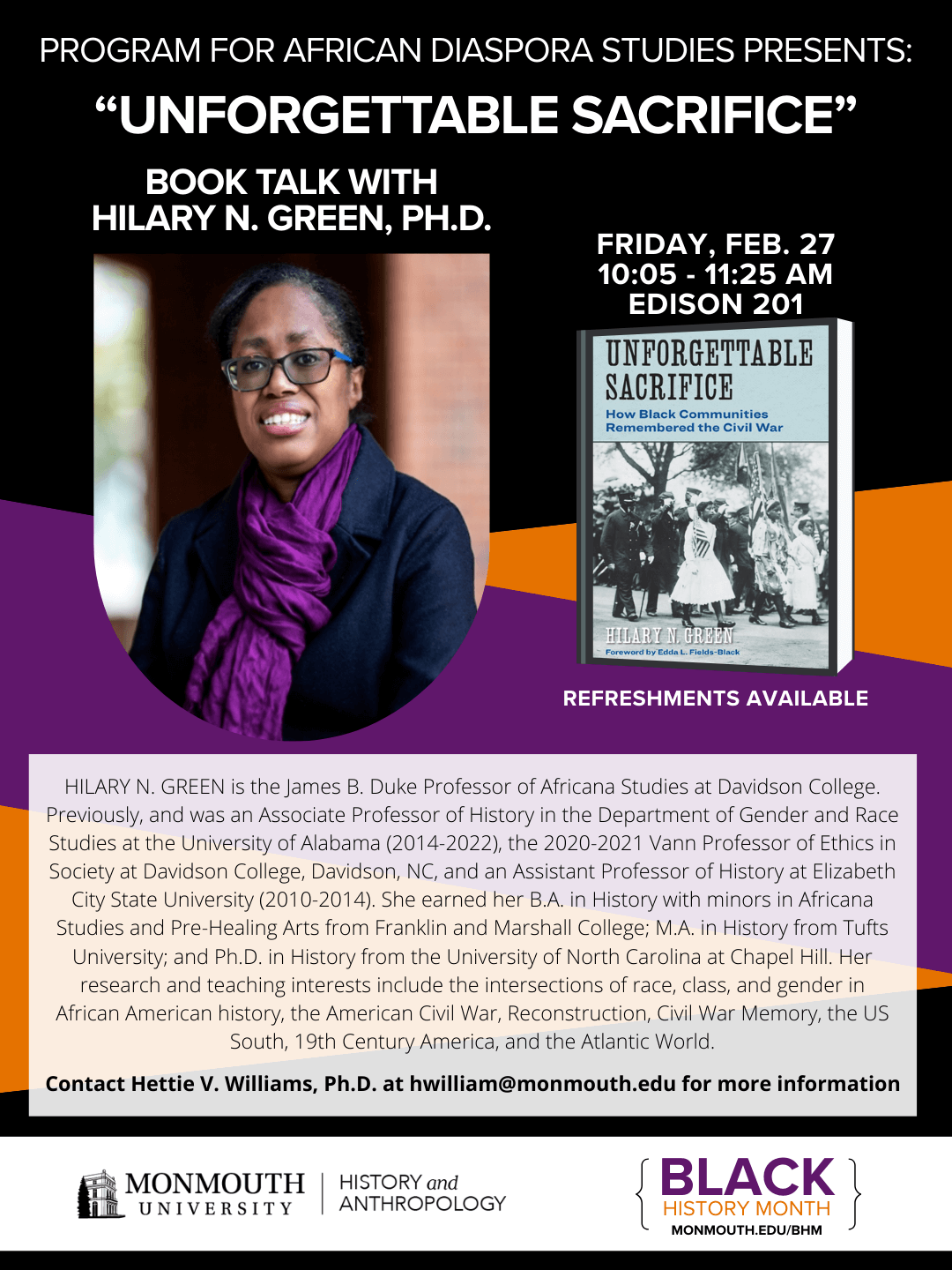 | 2/27 | African Diaspora Studies Program Lecture with Hilary Green, Ph.D. (Department of History & Anthropology) (Flyer) | 10:05 AM – 11:25 AM | Edison 201 |