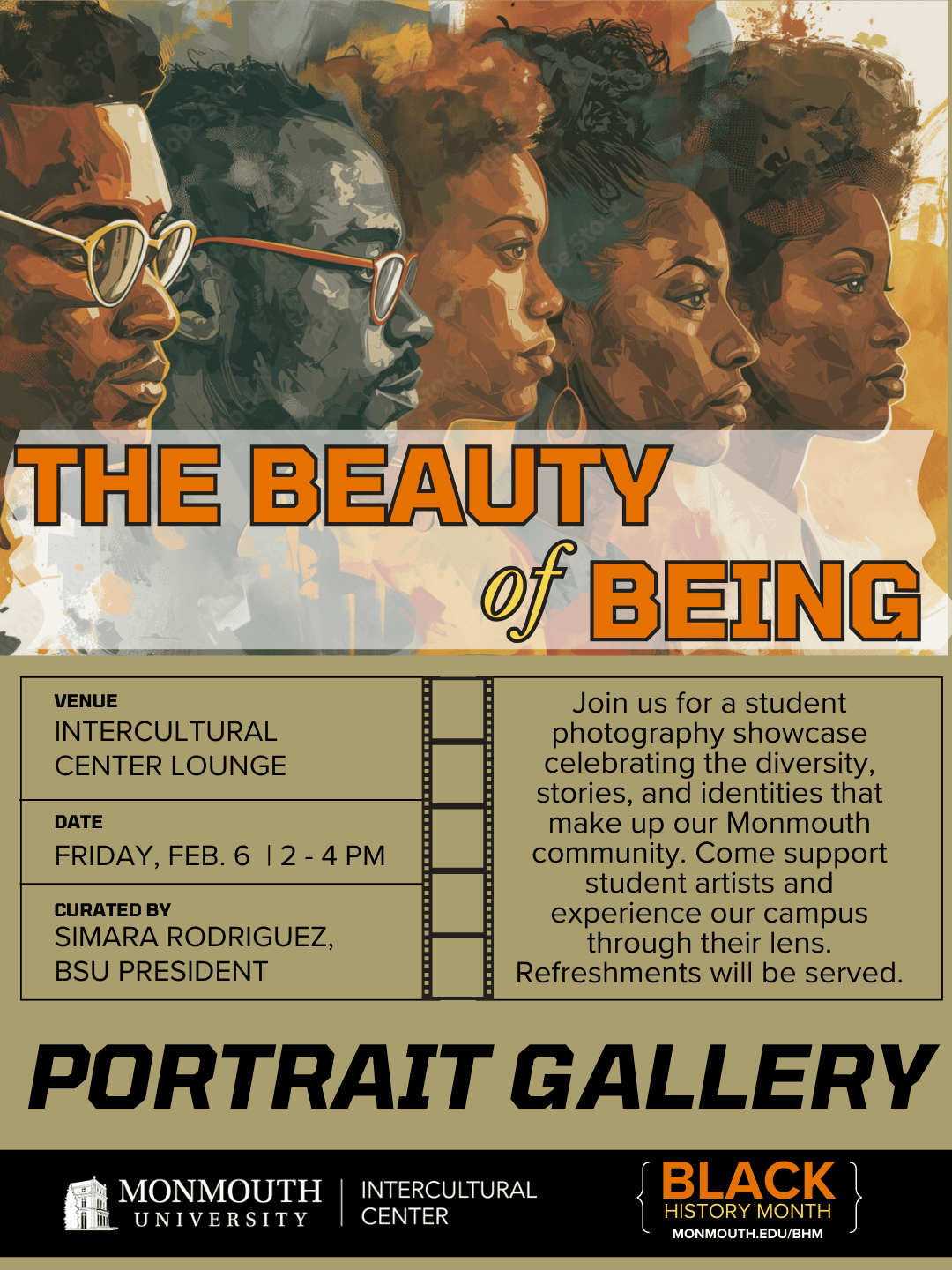 | 2/6 | The Beauty of Being: Student Portrait Gallery curated by BSU President, Simara Rodriguez (Flyer)* | 2 PM | Magill Commons Lounge (102) (Register) |