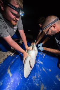 “We’ve realized that we’ve been catching mainly juveniles, so they’re younger, which can be a problem because you don’t want the babies to die—you want them to survive,” says Lauren Kelly, a junior MEBP student. “It seems like the sand tigers are the ones traveling further south than the sandbars and, we caught mostly sandbar females, which is another thing we’re trying to see— why are we catching mostly females?”