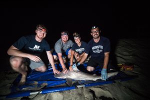 Summer 2017 was the first time Dunton and students from Monmouth’s Marine and Environmental Biology and Policy (MEBP) program tagged sharks as part of their summer research project. Partially funded through the School of Science’s biology department and the Urban Coast Institute, Dunton’s students, with help from Apex Anglers, dorsal fin–tagged 53 individual sharks over a 12-week period. Of those tagged, 15 sharks were also surgically implanted with the Vemco V-16-6H acoustic transmitters, which tracked the sharks’ movements for the past year.