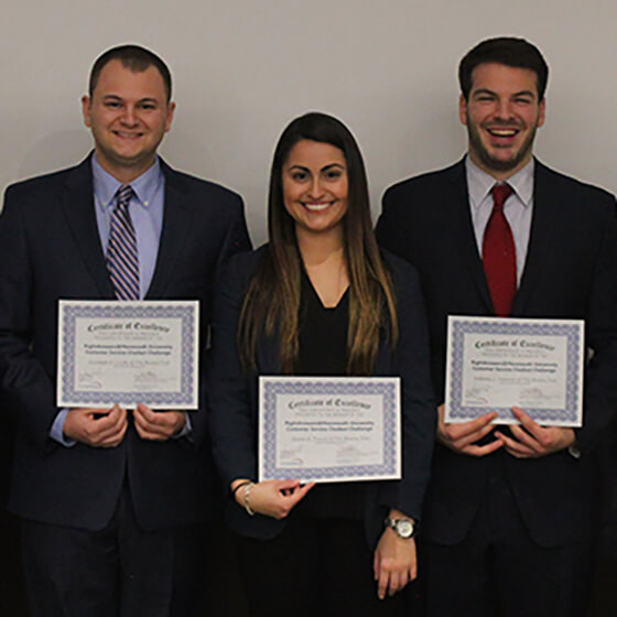 The winning team, called Binary Trio, consisted of MBA students Anthony Vazzana of Freehold, N.J., and Nicole Puccio of Marlboro, N.J., and senior computer science major Giuseppe Lacata of Manalapan, N.J. The team shared a $1,500 cash prize from RightAnswers.
