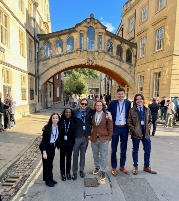 Monmouth University’s Model United Nations Team competed at the Oxford University Model United Nations competition (OxiMUN), Nov. 4-6. Ken Mitchell, Ph.D., professor in the Department of Political Science and Sociology, served as faculty advisor for six students on the trip to Oxford. According to Mitchell, OxiMUN is one of the most prestigious competitions on the European Model United Nations circuit, attracting some of the United Kingdom’s top universities, including the University of Cambridge, London School of Economics (LSE), University of Edinburgh, University of Glasgow, University of Bristol, Queen Mary University, and Irish institutions, including University College Dublin, as well as European powerhouses, especially from The Netherlands and Belgium. Monmouth University’s team alone represented the United States at OxiMUN.
