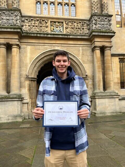 Mitchell notes that European Model UN contests give team awards to “small delegations,” with eight or fewer students, and “large delegations,” with more than eight students. At the contest, Monmouth won “Most Outstanding Small Delegation,” beating out universities like Cambridge, LSE, Edinburgh, Glasgow, and others. According to Mitchell, the Small Delegation category is the most competitive, and team awards require all members of a delegation to perform at a high level. Mitchell said that Monmouth’s six students arrived at OxiMUN with a wealth of past Model UN experience and that after weeks of preparation their team award was entirely deserved.