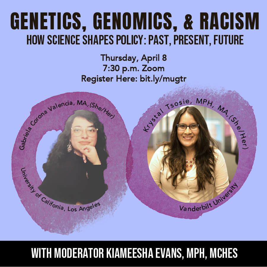 Kiameesha Evans, MPH, MCHES, specialist professor in the Department of Health and Physical Education, will moderate the discussion, which will examine the complicated relationship between genetics, genomics, and racism. Featured speakers Krystal Tsosie and Gabriela Corona Valencia will discuss their research as doctoral candidates and consider both the legacy of past genetic technologies and the future impacts of new genomic initiatives.