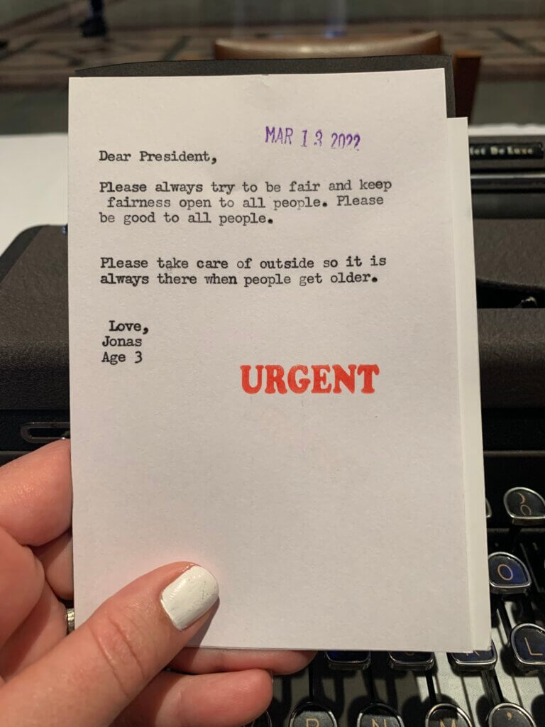 The CCS invited Oring to participate in the concert because Bielawa used text from Oring’s project in her composition. Oring’s typists collected messages to the president before and after the CCS concert and during the intermission. A typist also joined the CCS on stage during Bielawa’s piece, highlighting the sound of a typewriter as a sound-making instrument.