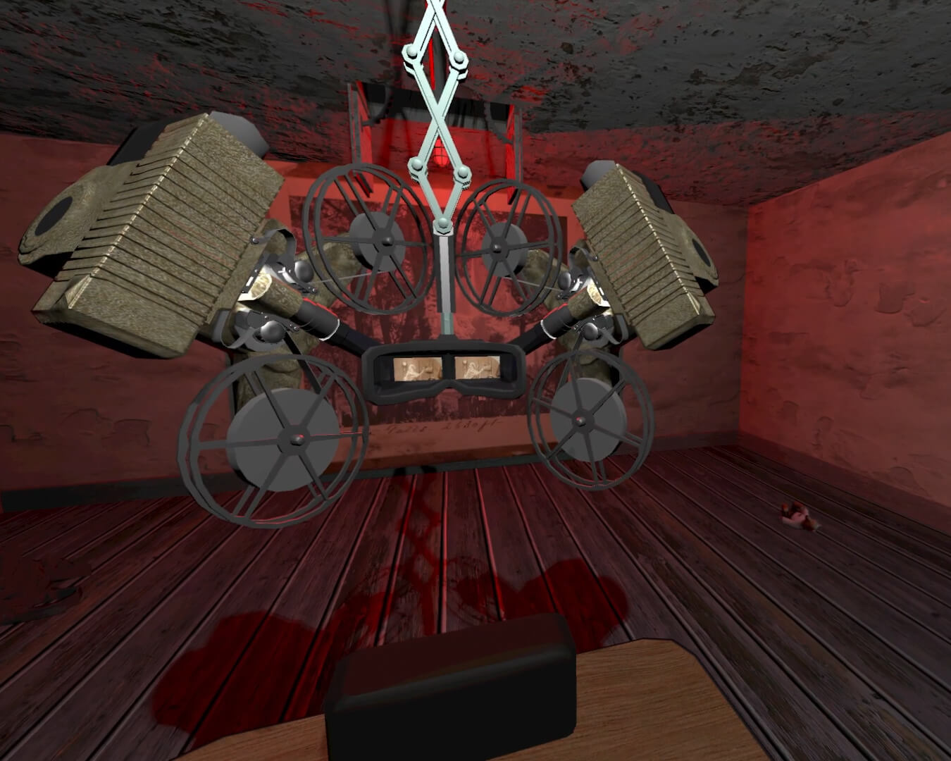 In this seated VR experience, subtitled “It’s No Game,” users encounter buttons and levers that prompt a series of surreal outcomes, including swimming eyeballs, a large zoetrope, teddy bears, bowls of fire, and additional controls. The work challenges users to discern expectations and confront the consequences of their choices. Monmouth University supported the creation of the project through a creativity and research grant and a summer fellowship.