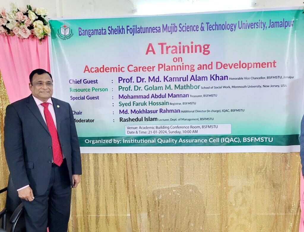 Golam Mathbor, Ph.D., professor in the School of Social Work, was recently invited to present at Academic Career Planning and Development programs at two universities in Bangladesh, Jagannath University and Bangamata Sheikh Fojilatunnesa Mujib Science and Technology University.