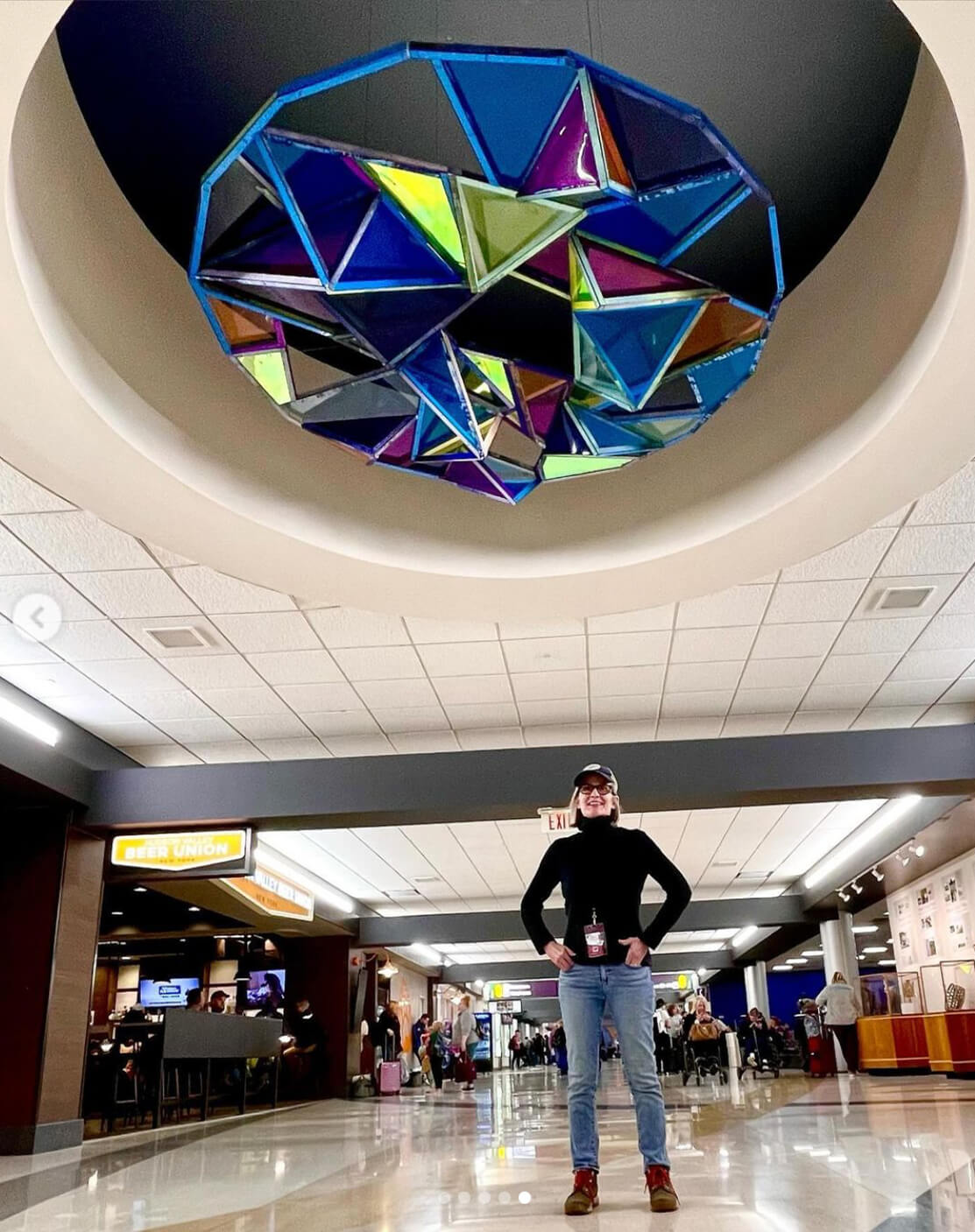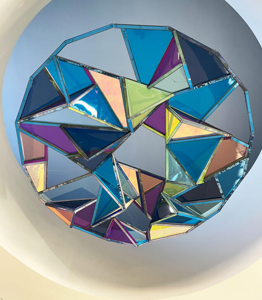 Susan Meyer, MFA, specialist professor in the Department of Art and Design, recently installed an 8-foot diameter sculptural installation, “Blue Portal,” at Albany International Airport in Albany, NY. Located in Concourse B of the terminal, the piece is suspended within a 12-foot overhead round aperture. Commissioned by the Airport, the piece will remain on view for three to five years. “Blue Portal” is constructed from 1-inch by 1-inch wood lengths clad in sheathing lasercut from acrylic and collage on wood. Inserts of vinyl create a colorful visual effect, especially when interacting with the natural light at the site.
