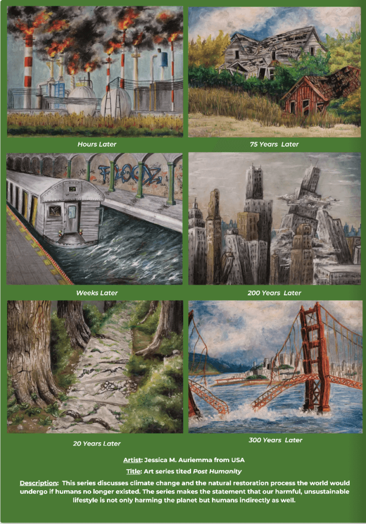 Auriemma’s pastel drawing series, “Post Humanity,” is featured as a full-page spread in the magazine. “Post Humanity” addresses climate change and the natural restoration process that the world would undergo if humans no longer existed. Callas has a 3D printed Eco-Portrait Mask included titled “Yarrow’s Second Sight.” Callas’s work focuses on the ‘ecological self’ and encourages viewers to understand humans as part of nature. Callas and Auriemma each have artwork that is also featured on the UNAI homepage. Each component of the “Post Humanity” series in available to view in greater detail, along with some of her other recent works, as part of Auriemma’s 2021 senior capstone presentation.