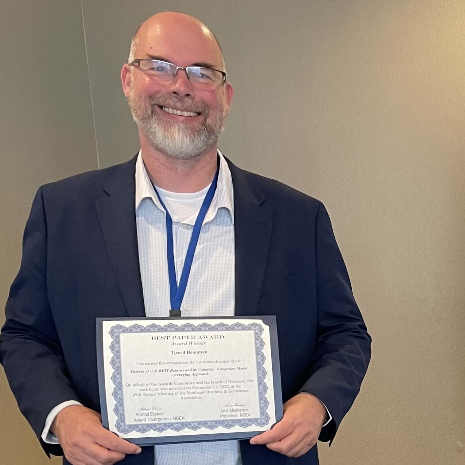 Boonman received a certificate and cash award for the paper, “Drivers of U.S. REIT Returns and its Volatility: A Bayesian Model Averaging Approach,” which was co-authored with Vivek Sah, Ph.D., director of the Franklin L. Burns School of Real Estate & Construction Management in the Daniels College of Business at the University of Denver. In the paper Boonman uses a machine learning technique to identify which are robust determinants of the returns and the volatility of the returns on U.S. office REITs. Boonman said the main findings of the paper can be useful for investors and policy makers.