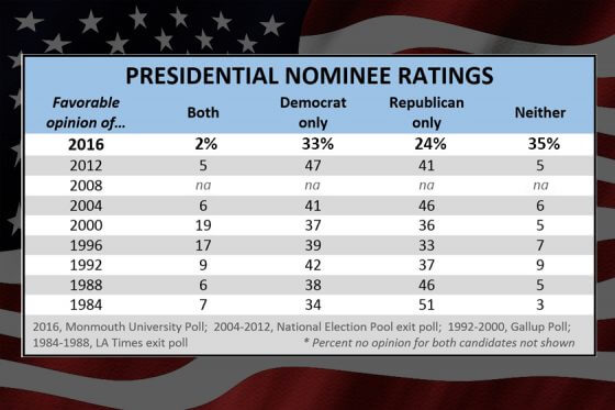 The number of voters who cannot bring themselves to voice a favorable opinion of either major party nominee is unlike anything witnessed in past elections according to new analysis from the Monmouth University Poll . Nearly no voters have a positive opinion of both Clinton and Trump while one-third do not have a favorable view of either candidate. These results are unusual.