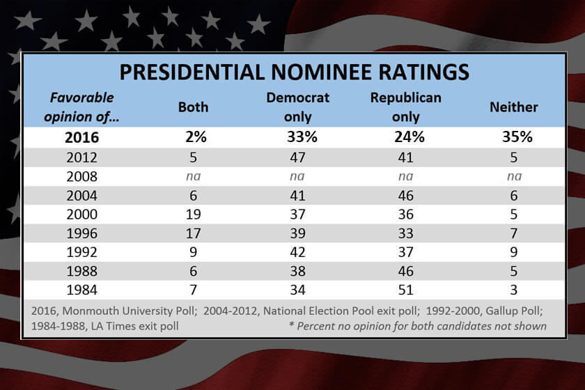 The number of voters who cannot bring themselves to voice a favorable opinion of either major party nominee is unlike anything witnessed in past elections according to new analysis from the Monmouth University Poll .  Nearly no voters have a positive opinion of both Clinton and Trump while one-third do not have a favorable view of either candidate. These results are unusual.