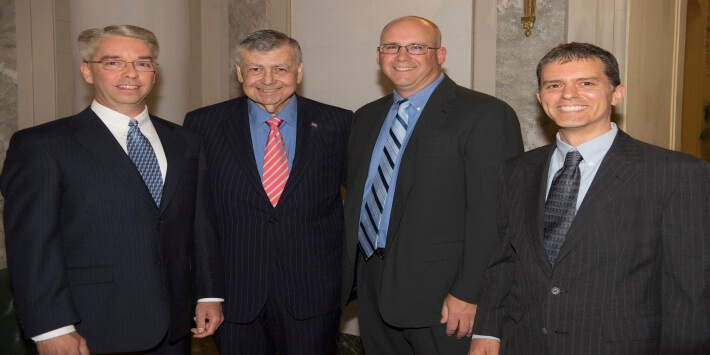 Pictured from left: Dave Martin, Hanover Park High School; William Roberts, Monmouth University Life Trustee; Doug Trumble, Toms River High School East; and Steve Kane, Ph.D., Bridgewater-Raritan Regional High School
