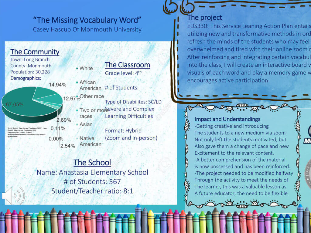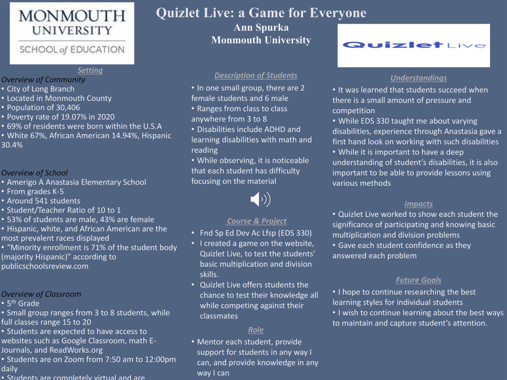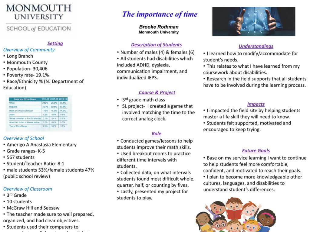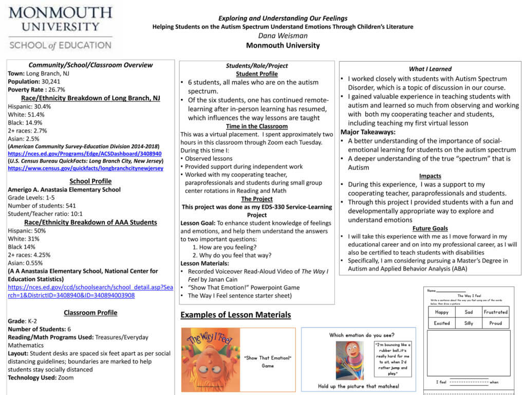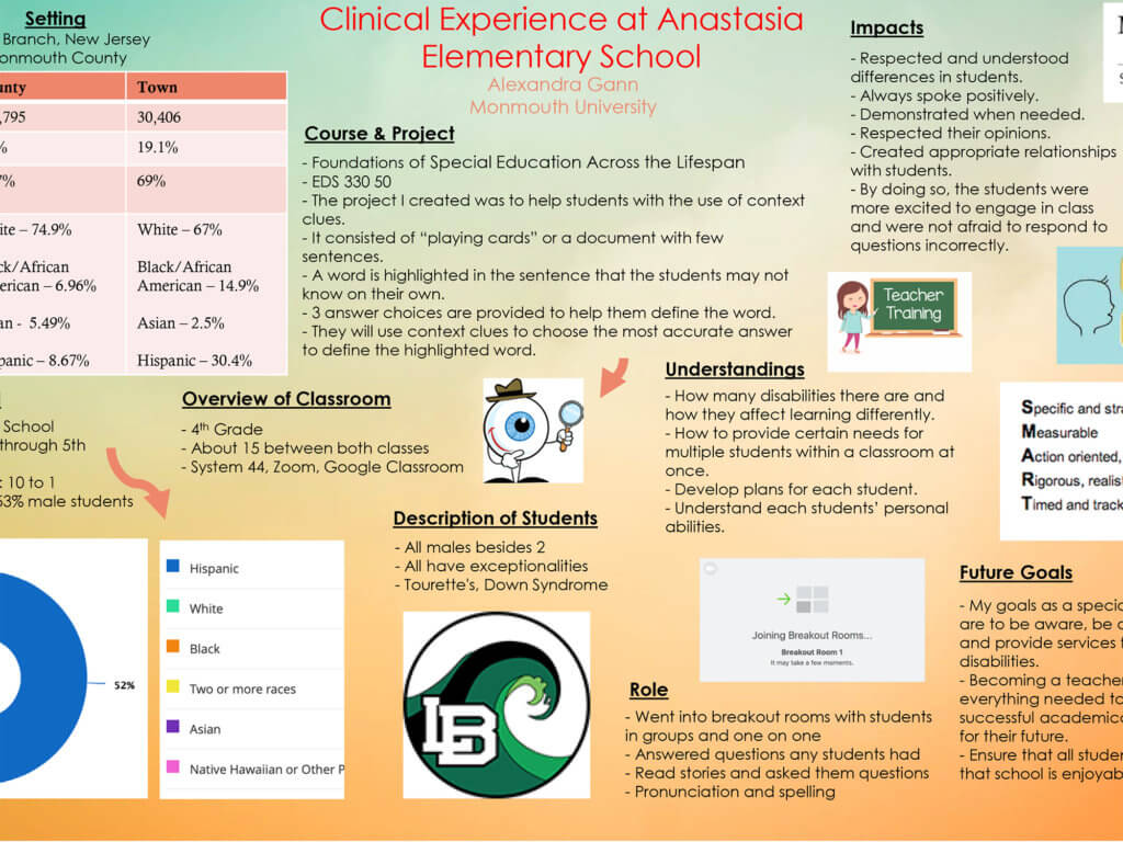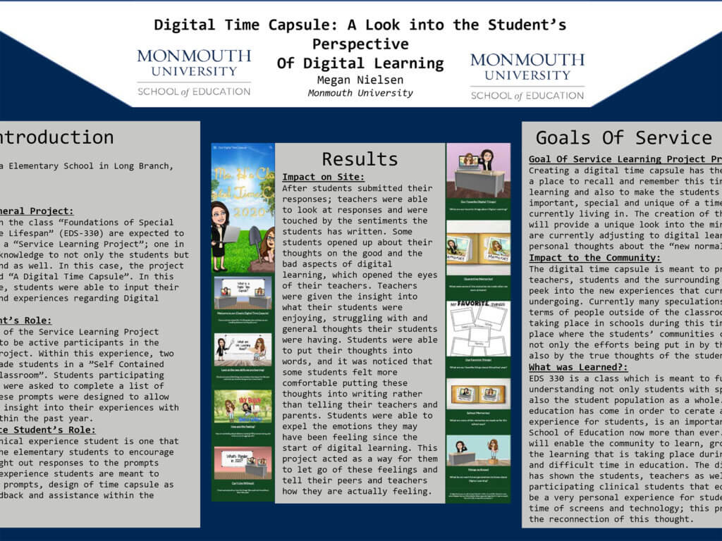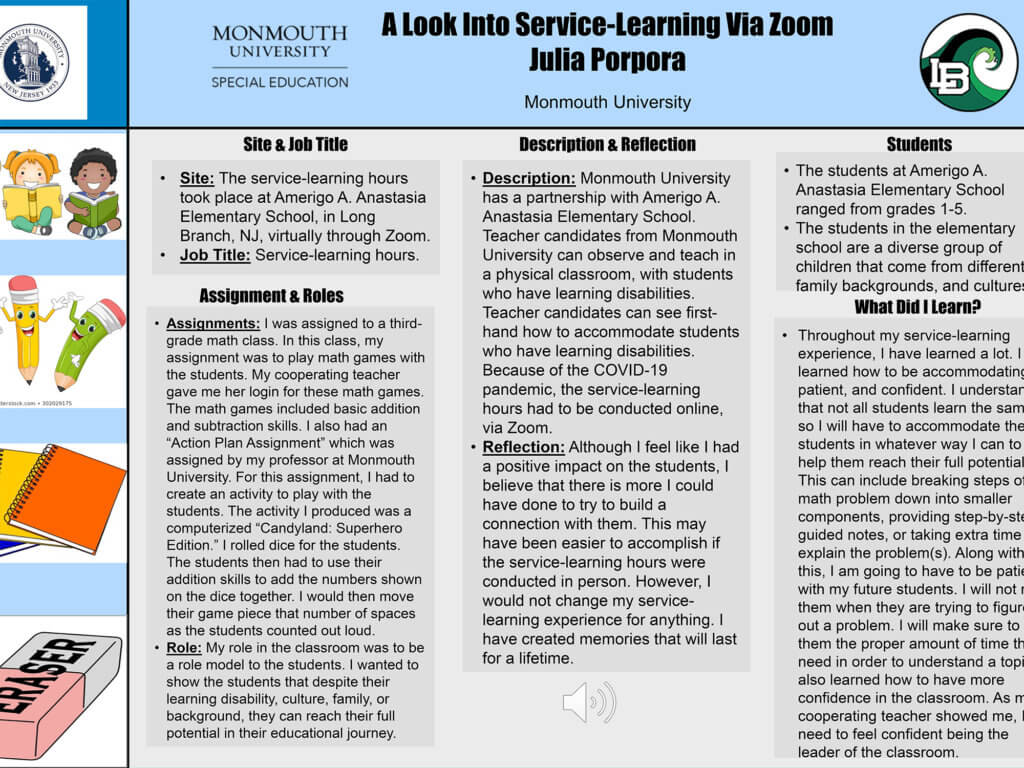 This includes critical reflection of fieldwork experiences through internship opportunities and clinical practice placements. Posters include reflection on the site, clients/students, assignments/role, as well as what the presenter learned through the experience and a reflection on how they impacted their site.