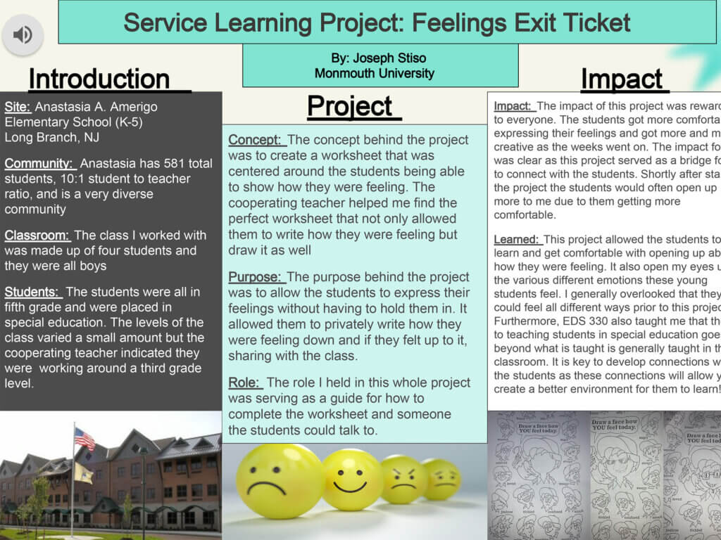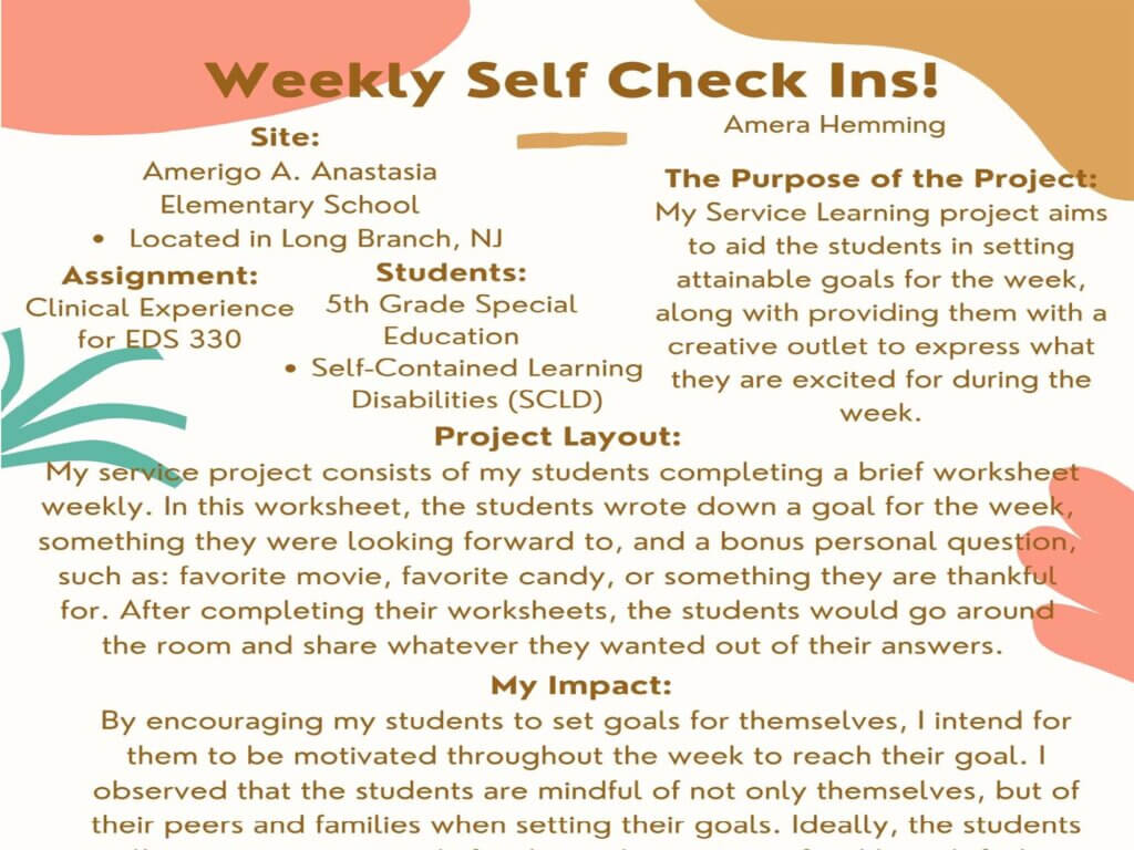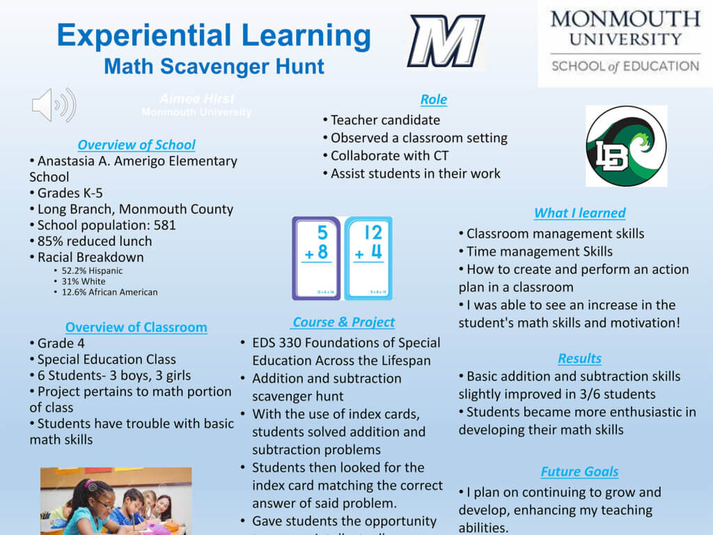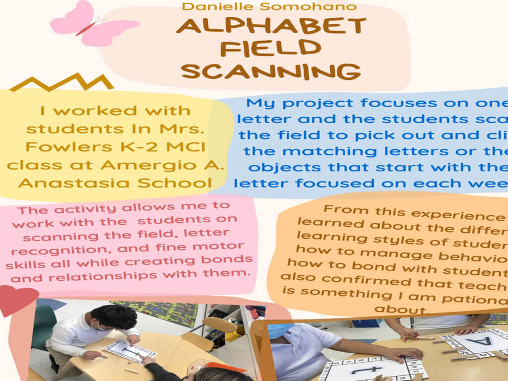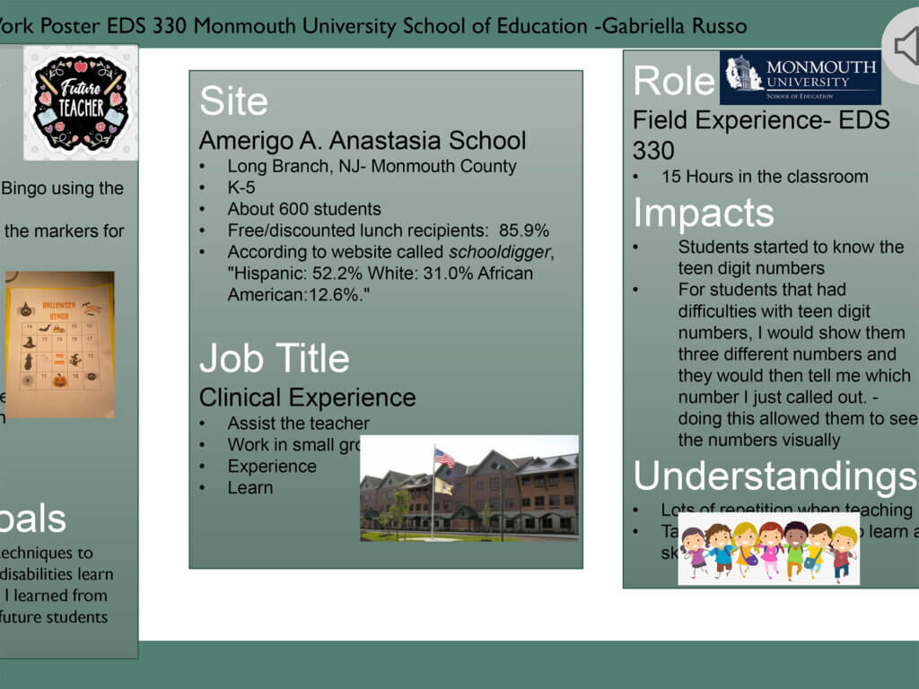 This includes critical reflection of fieldwork experiences through internship opportunities and clinical practice placements. Posters include reflection on the site, clients/students, assignments/role, as well as what the presenter learned through the experience and a reflection on how they impacted their site.