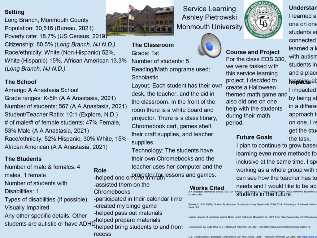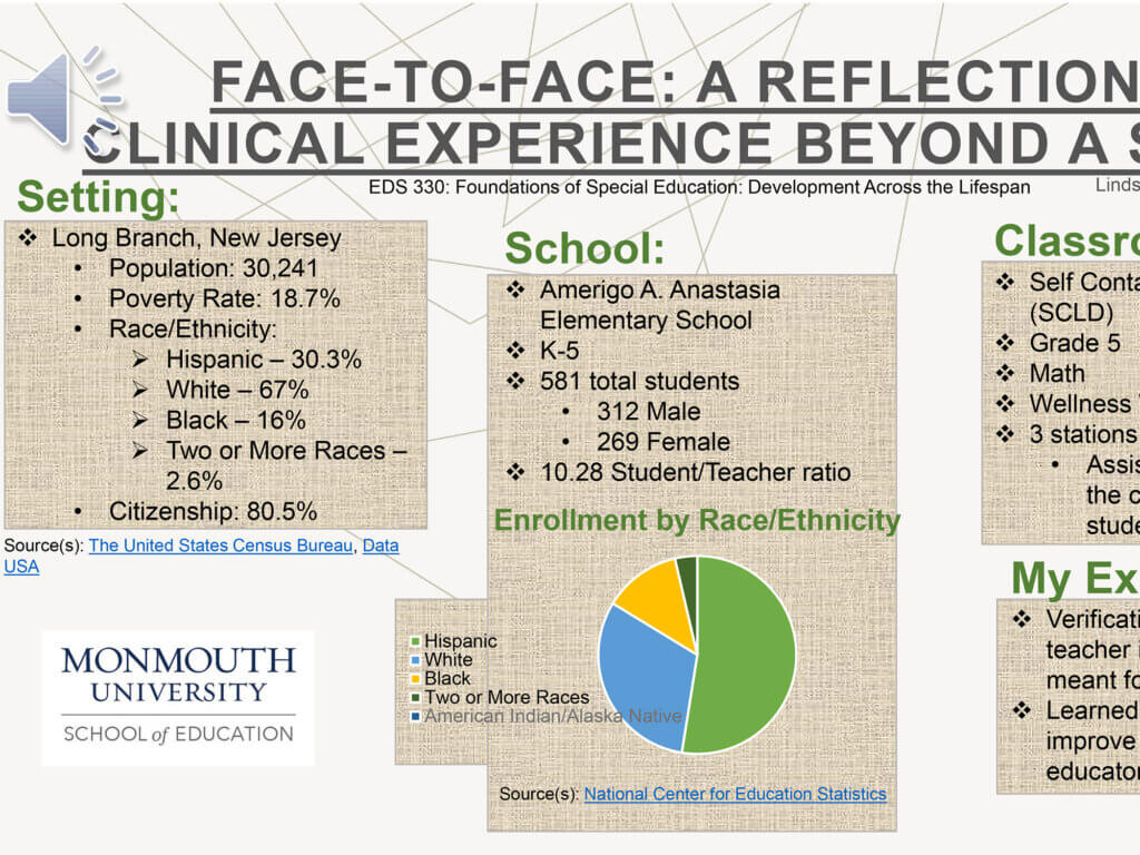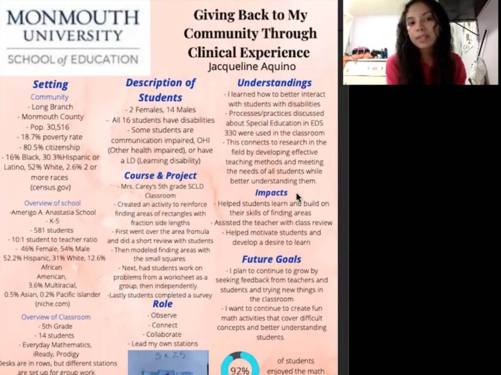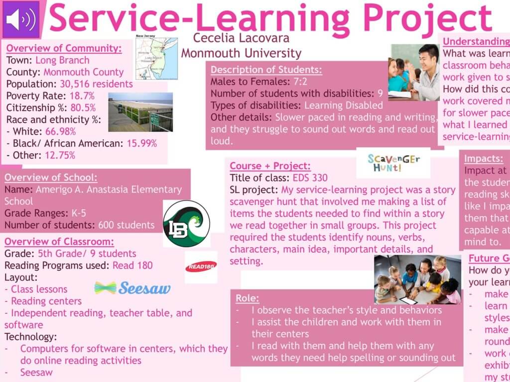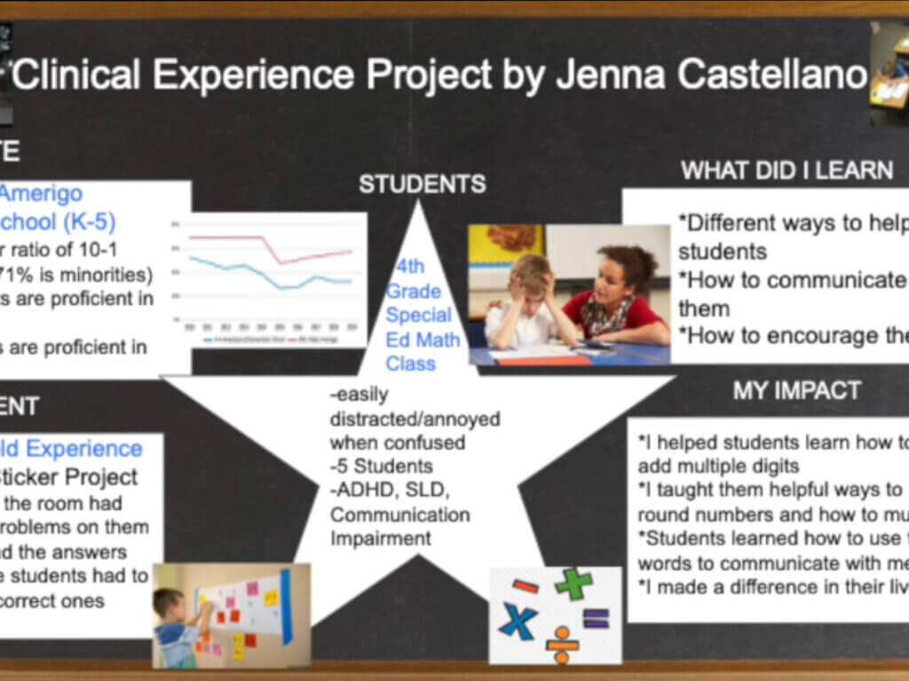 This includes critical reflection of fieldwork experiences through internship opportunities and clinical practice placements. Posters include reflection on the site, clients/students, assignments/role, as well as what the presenter learned through the experience and a reflection on how they impacted their site.