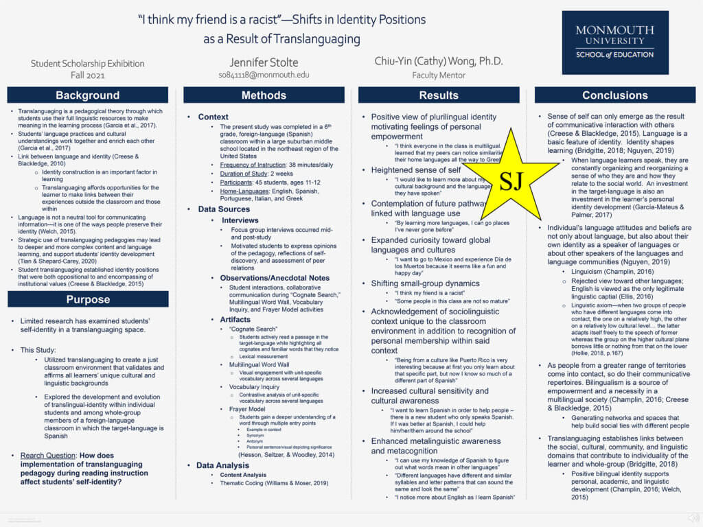 Posters with the gold star “SJ” icon, a Social Justice designation, indicate scholarship that promotes one of the following areas: Awareness, Advocacy, Activism.
