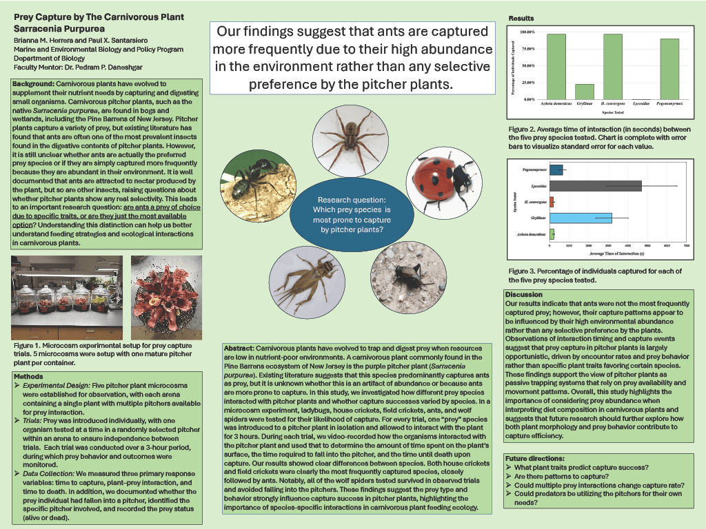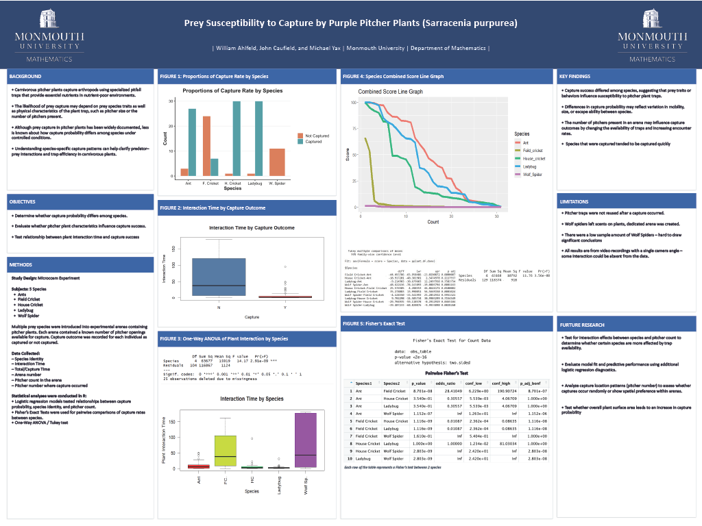 Previous diet analysis of the carnivorous purple pitcher plant has suggested that ants are the primary prey captured. Is this because ants are easy to capture? Is this because ants are more abundant than other prey species in the pitcher habitat? We experimentally examined the capture rate of five different prey species (ants, house crickets, field crickets, ladybugs, and wolf spiders) by pitcher plants in a microcosm experiment. Individual prey were placed with a pitcher plant in isolation and video recorded for 3 hours so that their interaction could be observed. Interactions were timed, and mortality (if any) was recorded, including time of interaction with plant, time to capture and time to die. Pitcher morphology (e.g., volume, space, and number of traps) was also measured as an independent variable. Five arenas were used, each containing a single purple pitcher plant (Sarracenia purpurea), with arenas rotated to minimize confounding variables such as spider scent trails. The goal is to determine if ants are primarily captured due to susceptibility or environmental abundance, and which species is most prone to capture overall. Preliminary statistical analysis will compare capture rates, interaction times, and mortality across species using variables like arena number, plant traits, and interaction times. Results will provide insights into pitcher plant ecology, informing conservation efforts amid growing popularity of carnivorous plants in the horticultural industry.