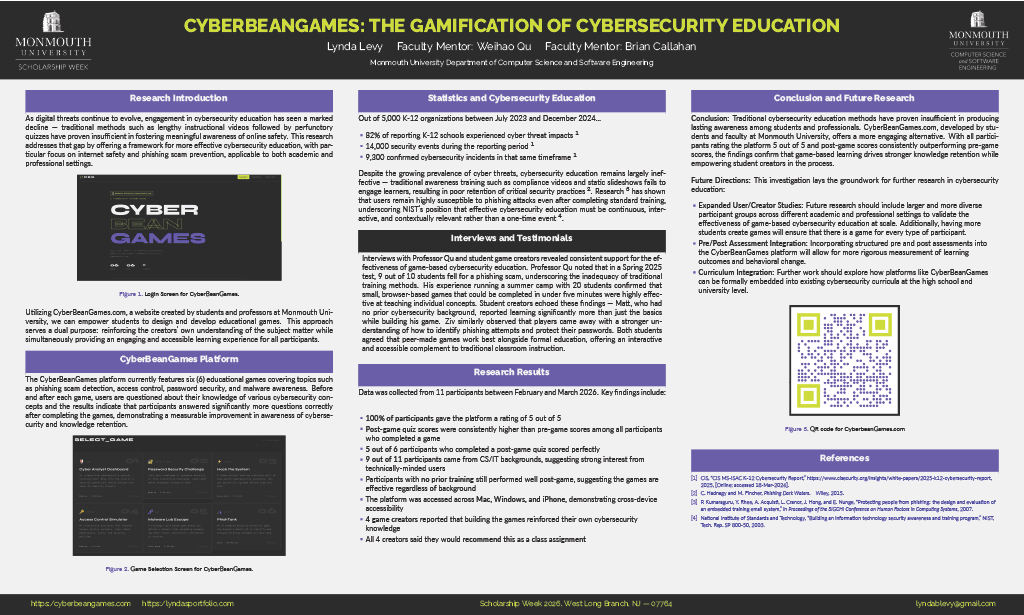Traditional cybersecurity education methods have proven insufficient in producing lasting awareness among students and professionals. CyberBeanGames.com, developed by students and faculty at Monmouth University, offers a more engaging alternative. With all participants rating the platform 5 out of 5 and post-game scores consistently outperforming pre-game scores, the findings confirm that game-based learning drives stronger knowledge retention while empowering student creators in the process.