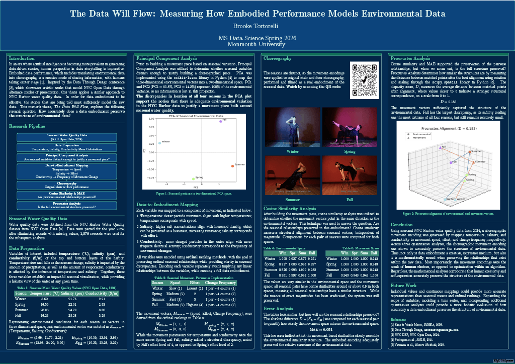 In an era where artificial intelligence is becoming more prevalent in generating data-driven stories, human perspective in data storytelling is imperative. Embodied data performance, which includes translating environmental data into choreography, is a creative mode of sharing information, with humans taking center stage. In order for data embodiment to be effective, the stories that are being told must sufficiently model the raw data. This thesis poses the question: how accurately does a data embodiment preserve the structure of environmental data? To explore this, water quality data from NYC Harbor were obtained from NYC Open Data. Data were filtered to 1,578 complete records from 2024 and divided into four seasons. Three variables, temperature, salinity, and conductivity, were mapped to choreographic movement parameters: movement speed, effort, and frequency of change, respectively. These mappings were applied to original chair and floor choreography, performed and filmed as a real embodiment of the seasonal data. To evaluate how well the movement encoding preserved the structure of the environmental data, four quantitative analyses were performed, including Principal Component Analysis, cosine similarity analysis, Mean Absolute Error analysis, and Procrustes Analysis. The results indicated that there were distinct qualities within the variables for each season, relationships between seasons were maintained, and structural differences between environmental and movement spaces were minimal in two- and three-dimensional spaces. Not only is data embodiment a creative, expressive medium, but also it is mathematically sound when preserving the relationships that exist within the raw data. Most importantly, the movement encodings were the result of human choices, as opposed to optimization within an algorithm.