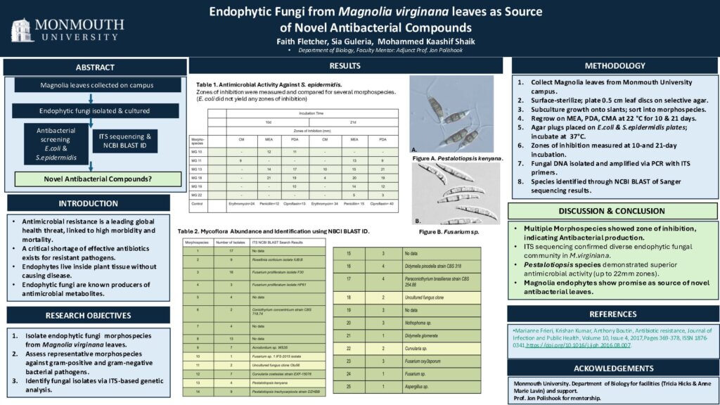 Endophytic fungi colonize plant tissues without causing disease and have been shown to produce a wide range of bioactive secondary metabolites. As antibiotic resistance among bacterial and fungal pathogens continues to increase, endophytc fungi remain a promising source of novel antibiotic compounds. In this study, endophytic fungi were isolated from Sweetbay Magnolia (Magnolia virginiana) leaves collected from Monmouth University campus and screened for antibacterial activity. Leaf tissue, prepared as 0.5 cm discs, were surface sterilized and plated on selective agar to recover fungal species. Emerging fungal growth was subcultured to agar slants for enumeration and differentiation into morphospecies. Representative morphospecies were then grown on the production media malt extract agar plates (MEA), potato dextrose agar (PDA), and cornmeal agar plate (CMA) incubated at room temperature (22°C) for up to 21d. Agar discs of each regrown morphospecies were placed onto plates that were inoculated with a gram-positive bacterium (S. epidermatis) and a gram-negative bacterium (E. coli) and incubated overnight at 37 °C. The size of any zone of inhibition demonstrated antibacterial activity which will be compared to commercially available compounds to ascertain novelty. Genomic DNA was successfully extracted from each morphospecies and ITS PCR amplification was performed and confirmed by gel electrophoresis and Nanodrop analysis. Each morphospecies was (Sanger) sequenced by an outside vendor. Fungal species identification was ascertained through NCBI Blast searches of the resulting sequences.