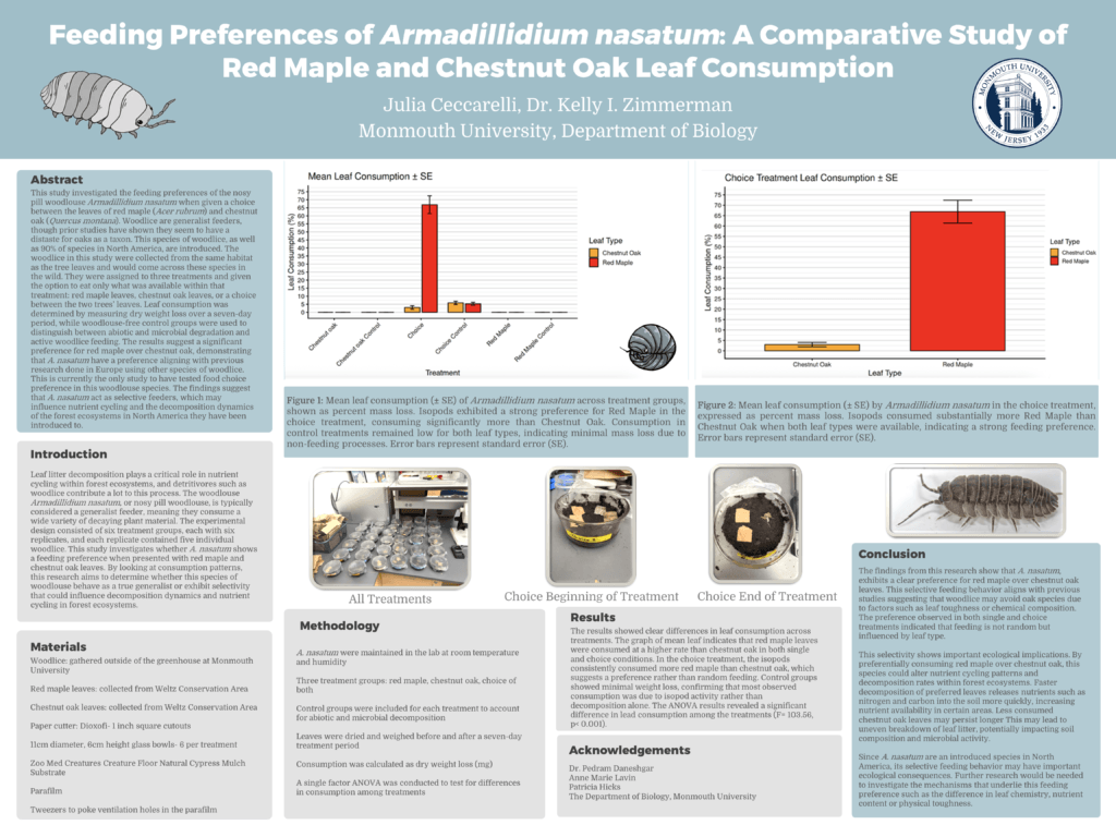 This study investigated the feeding preferences of the nosy pill woodlouse Armadillidium nasatum when given a choice between the leaves of red maple (Acer rubrum) and chestnut oak (Quercus montana). Woodlice are generalist feeders, though prior studies have shown they seem to have a distaste for oaks as a taxon. This species of woodlice, as well as 90% of species in North America, are introduced. The woodlice in this study were collected from the same habitat as the tree leaves and would come across these species in the wild. They were assigned to three treatments and given the option to eat only what was available within that treatment: red maple leaves, chestnut oak leaves, or a choice between the two trees’ leaves. Leaf consumption was determined by measuring dry weight loss over a seven-day period, while woodlouse-free control groups were used to distinguish between abiotic and microbial degradation and active woodlice feeding. The results suggest a significant preference for red maple over chestnut oak, demonstrating that A. nasatum have a preference aligning with previous research done in Europe using other species of woodlice. This is currently the only study to have tested food choice preference in this woodlouse species. The findings suggest that A. nasatum act as selective feeders, which may influence nutrient cycling and the decomposition dynamics of the forest ecosystems in North America they have been introduced to.