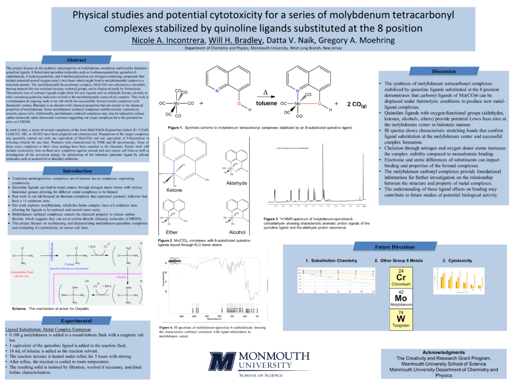 This project focuses on the synthesis and properties of molybdenum complexes stabilized by bidentate quinoline ligands. 8-Substituted quinoline molecules such as 8-ethanonequinoline, quinoline-8-carbaldehyde, 8-hydroxyquinoline, and 8-methoxyquinoline are nitrogen-containing compounds that include potential neutral oxygen atom Lewis bases which might bind to molybdenum(0) centers in a bidentate manner. The molybdenum(0) hexacarbonyl complex, Mo(CO)6 was selected as a favorable starting material for test reactions because carbonyl groups can be displaced easily by thermolysis. Thermolytic loss of carbonyl ligands might allow for new ligands such as aldehyde, ketone, alcohol, or ether containing quinoline molecules to bind to the molybdenum(0) center of the complex. This work is a continuation of ongoing work in our lab which has successfully formed similar complexes with rhenium(I) centers. Rhenium is an element with chemical properties that are similar to the chemical properties of molybdenum. Some molybdenum carbonyl complexes exhibit intrinsic cytotoxicity towards cancer cells. Additionally, molybdenum carbonyl complexes may also be induced to release carbon monoxide under ultrasound treatment suggesting our target complexes have the potential to serve as CORMS.
