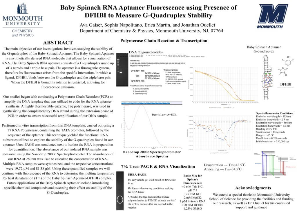 Performed in vitro transcription from this DNA template, carried out using a T7 RNA Polymerase, containing the TATA promoter, followed by the sequence of the aptamer. This technique yielded the functional RNA substrates utilized to explore the stability of the G-quadruplex found in our aptamer. Urea-PAGE was conducted next to isolate the RNA in preparation for quantification. The absorbance of our isolated RNA sample was measured using the Nanodrop 2000c Spectrophotometer. The absorbance of our RNA at 260nm was used to calculate the concentration of RNA. Multiple RNA samples were synthesized, and the respective concentrations were 19.72 µM and 81.38 µM. Using these quantified samples we will continue with fluorescence of the RNA to determine the melting temperature by heat denaturation (Tm) of the Baby Spinach Aptamer-DFHBI complex. Future applications of the Baby Spinach Aptamer include introducing specific chemical compounds and assessing their effect on stability of the G-Quadruplex.
