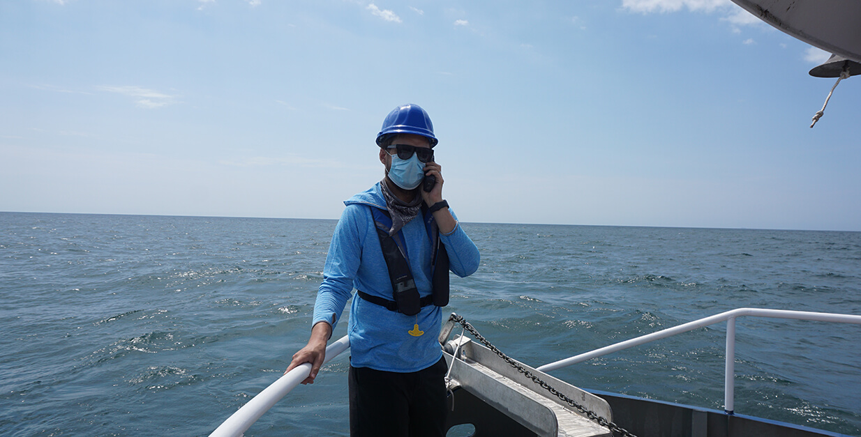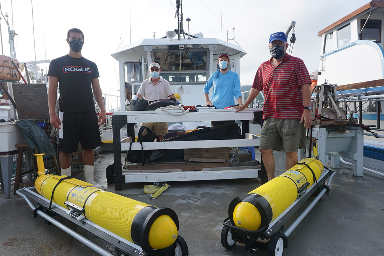 The gliders were launched from Monmouth University’s research vessel Heidi Lynn Sculthorpe at locations between the shipping lanes that approach New York Harbor. The crew included (seen above from l-r) Monmouth student Bryce McCall, Rutgers University scientists Scott Glenn and Travis Miles, UCI Marine Scientist Jim Nickels, and (not pictured) UCI Communications Director Karl Vilacoba.