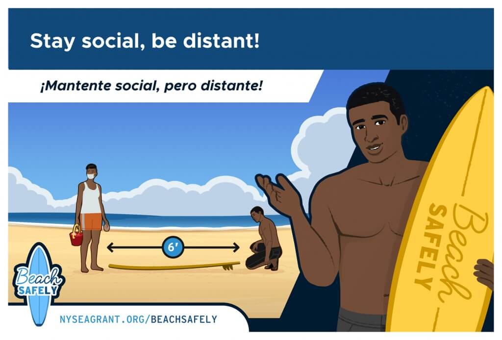 Now in its second year, #BEachSAFEly was developed by the New Jersey and New York Sea Grant programs at the height of the pandemic to build awareness of precautions that visitors should take while at the beach. The 2020 campaign featured nine bilingual (available in English and Spanish) illustrated messages, which stressed standard ocean hazard tips such as “Break the Grip of the Rip” as well as messages related to the pandemic such as, “Stay social, be distant”; “Don’t let your mask become marine debris!”; “Stay dry when waves are high”; and “Grab your sunscreen and sanitizer.”