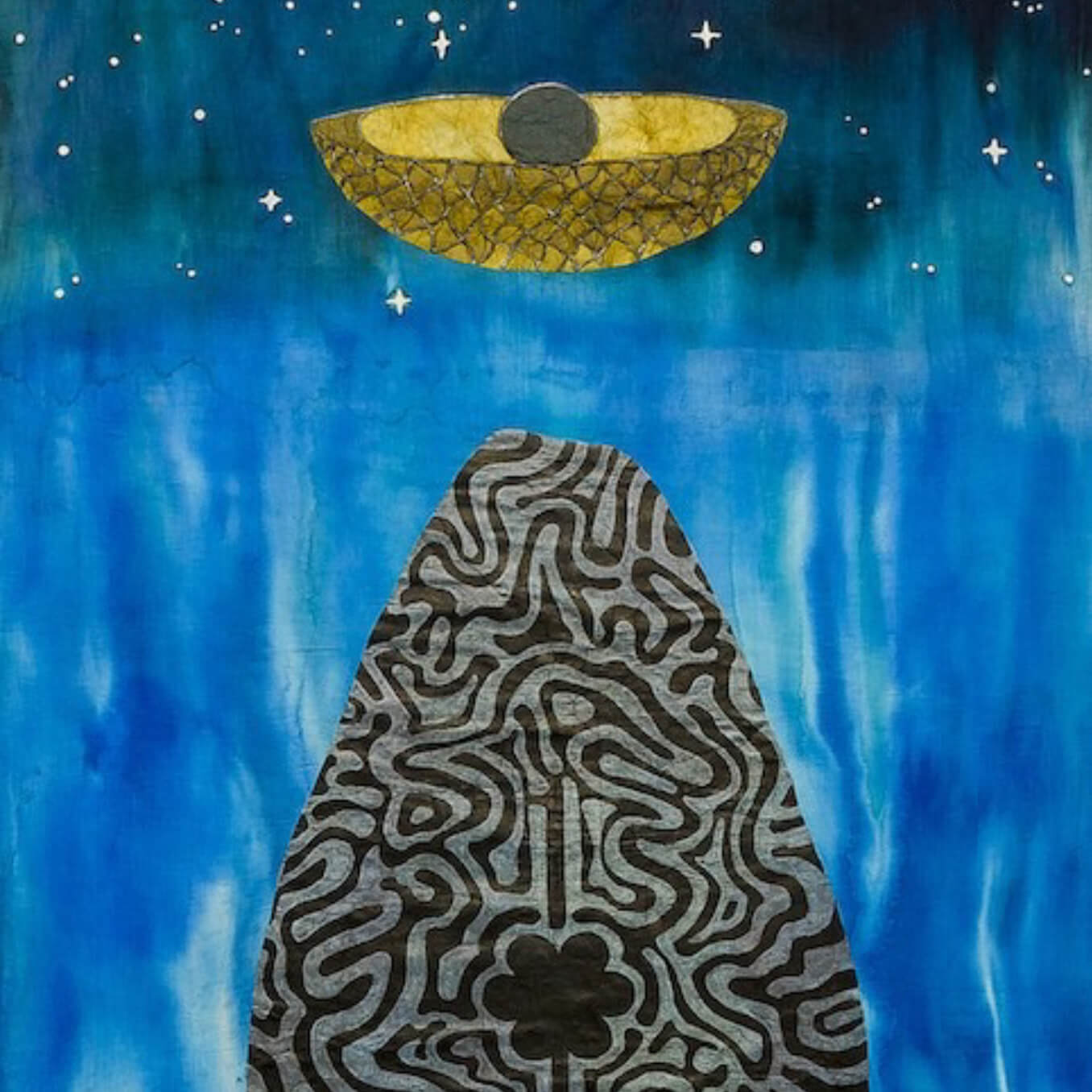 During the fellowship, Callas created a series of large-scale (10′) drawings that connect images of the ocean, ocean archetypes, and the human body. Inspired by historical nautical charts hand-drawn and mounted on muslin, her drawings are made of graphite, dye, and India ink on paper and dyed muslin. They are then mounted on canvas. In the drawings, Callas uses latitude and longitude lines, and depth charts to ‘specifically place’ the work in places that follow the endangered North Atlantic right whale’s annual migration through the Jersey Shore. The drawings include symbols like the whale, fish, boat, net and horizon line, and archetypes like ‘the night sea journey,’ a journey navigated by stars to a new shore.